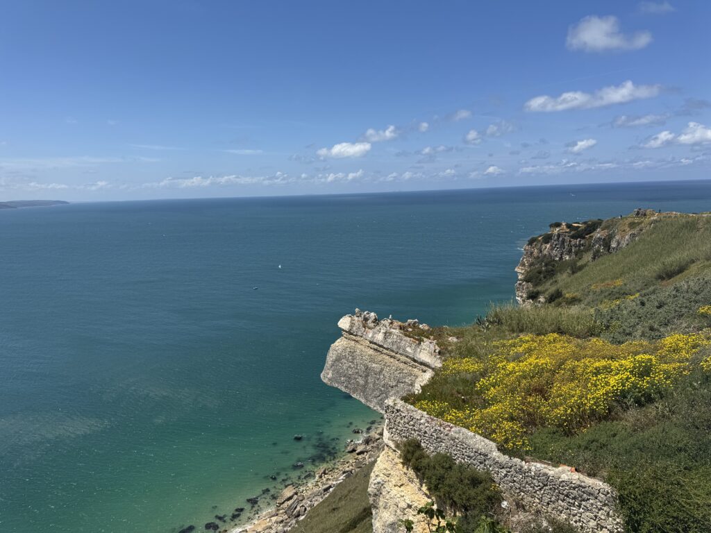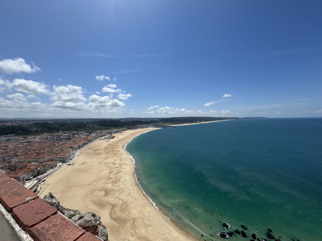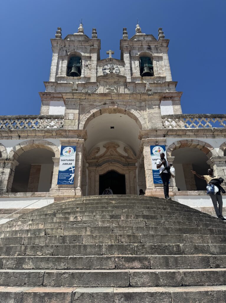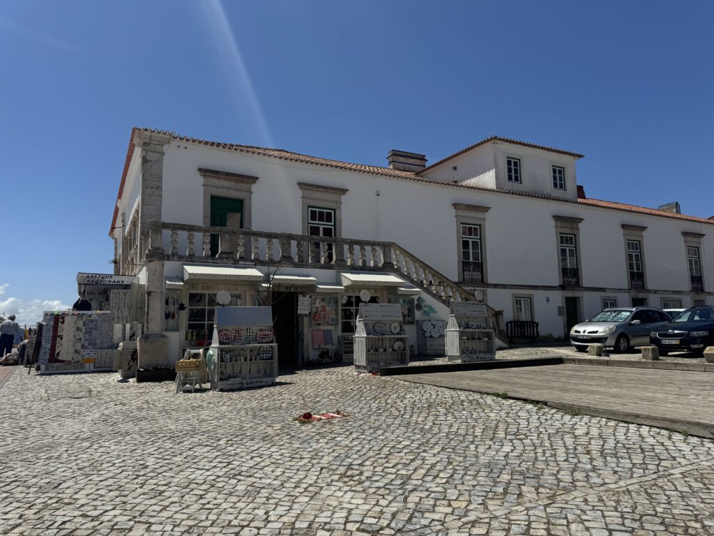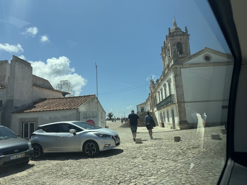 I took a daytrip tour from Lisbon to get to Nazare as a part of three places we’d visit that day. The reason for inclusion for the tour was mos likely because Nazare is famous for the highest waves for surfing. Nazaré, a small fishing village on Portugal’s west coast, has gained worldwide fame for having some of the most powerful waves ever surfed. Average height of waves is 50-65’ high but one surfer hit record-breaking wave height of 101’ surfed by Rodrigo Koxa in November 2017, earning him the Guinness World Record for the largest wave ever surfed. (Citation : https://www.surf-escape.com/surfing-in-portugal/nazare/….) But as our tour bus pulled into Nazarre, the first thing we saw actually was the historic hospital, much to my amazement.