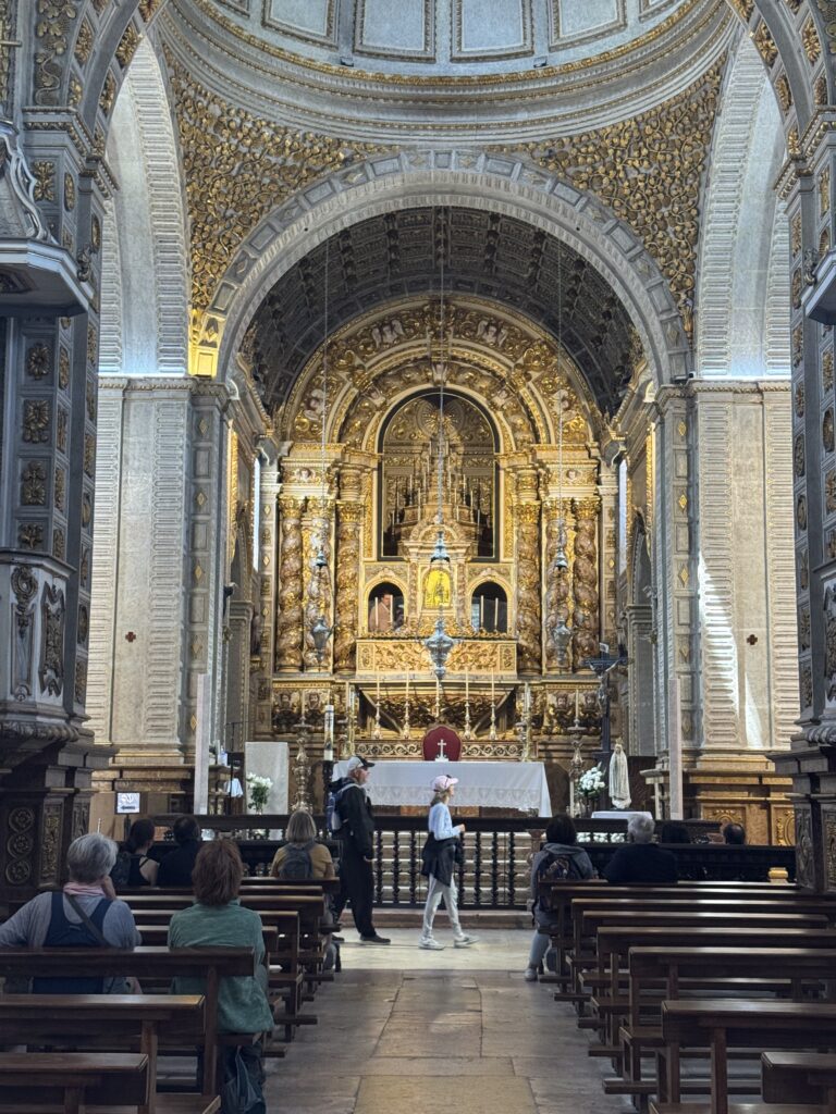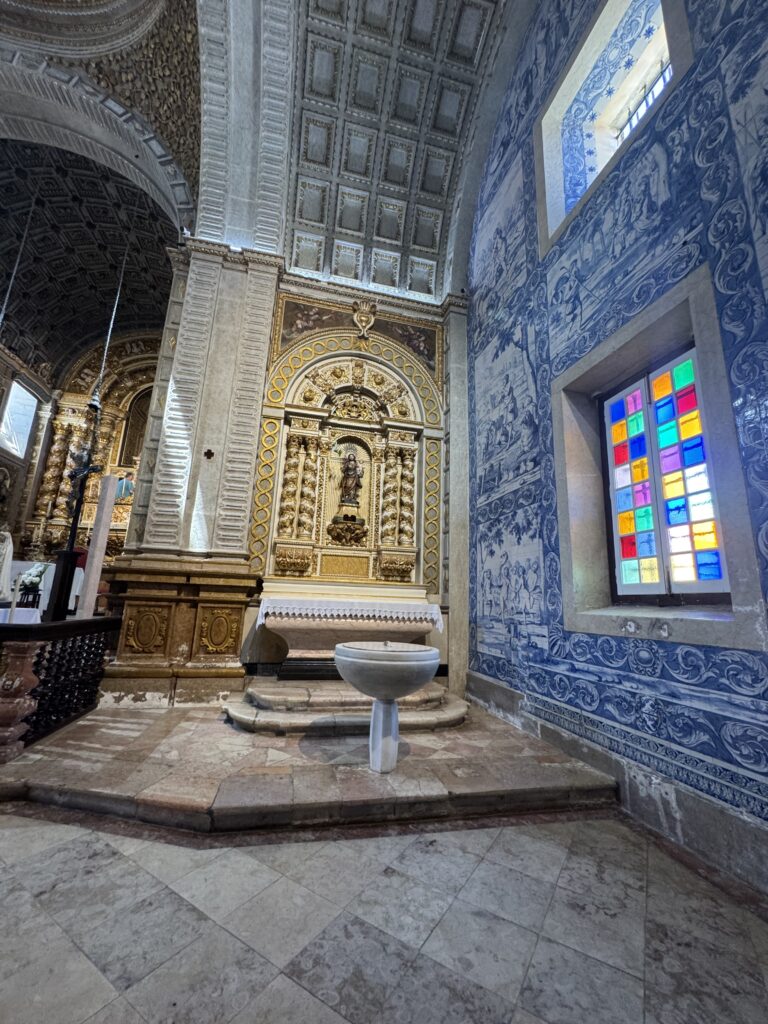The Hospital, is attached to the Sanctuary of our Lady of Nazareth which is an astoundingly beautiful structure. The church was founded during the 14th century during the Pilgrammage of King Ferdinand. He ordered it built to accommodate the larger numbers of people who wanted to come to pray to Our Lady of Nazare. At that time the wooden porch but even later King Manuel 1 renovated the Sanctuary to have a new staircase built, which consisted of semicircular steps that go up to Baroque portal which sit majestically below two square bell towers. Then later the main chapel was worked on extensively and was completed in 1691. In 1708, much tilework was done to adorn the Church by a Dutch artist/ceramist Williem Van der Klöet. These tiles are just lovely and give a very welcoming feel to the entry. Interior to the nave, which is in a high-cross plan, in addition to the golden altarpiece there are corridors of the Sacristy were covered with blue and white tiles by the Portuguese master António de Oliveira Bernardes in 1714. This was especially beautiful and seemed intrinsically Porutugese. (citation https://en.wikipedia.org/…/Sanctuary_of_Our_Lady_of…) Under the decorative aspe, a statue of Nossa Senhora da Nazaré sits in a lit niche above the main altar, which has twisted columns to each side. All this is under a coffered ceiling.