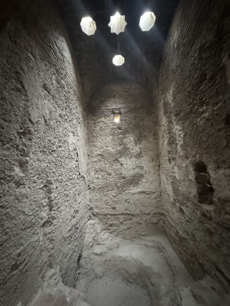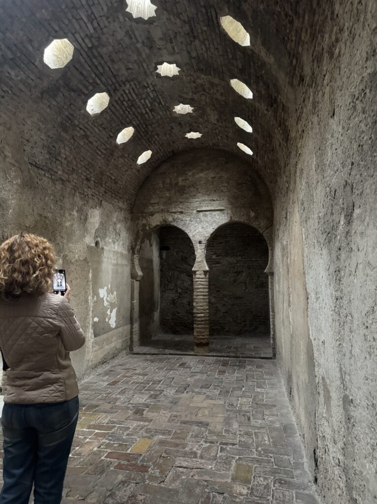 • El Bauelo , is the oldest civil building of Muslim Granada. The site is a public arab bath served as a place where physical and spiritual cleansing happened daily between the 12th – 16th century.. This was one of the few buildings spared from destruction of the Christian Monarchs, and now has been a UNESCO site since 1994 thanks to extensive preservation efforts. This Hammam during the time of Al-Andalus, had 21 arab baths. The baths have a traditional order in the chambers, frigidarium (cold) , tepidarium (warm) and caldarium (hot) which are baths of varying degrees of increasing warmth from cold to hot, sequentially.  The most striking and beautiful part of this building is the pierced skylights of stars and octagons on the vaulted ceiling which resemble constellations in the sky. This also allowed for ventilation of the bath spaces, as well.  The arched colonnades form rooms within the Hammam, separating areas from one another, the columns are topped with capitals with motifs from Roman, Visigothic and Caliphase origins. The act of bathing oneself at a Hammam consisted of purification of the body through the baths and providing hygienic care. But outside of just hygiene, the baths provided a space for social, political and business meetings in Granada as one of the main public buildings of its time.